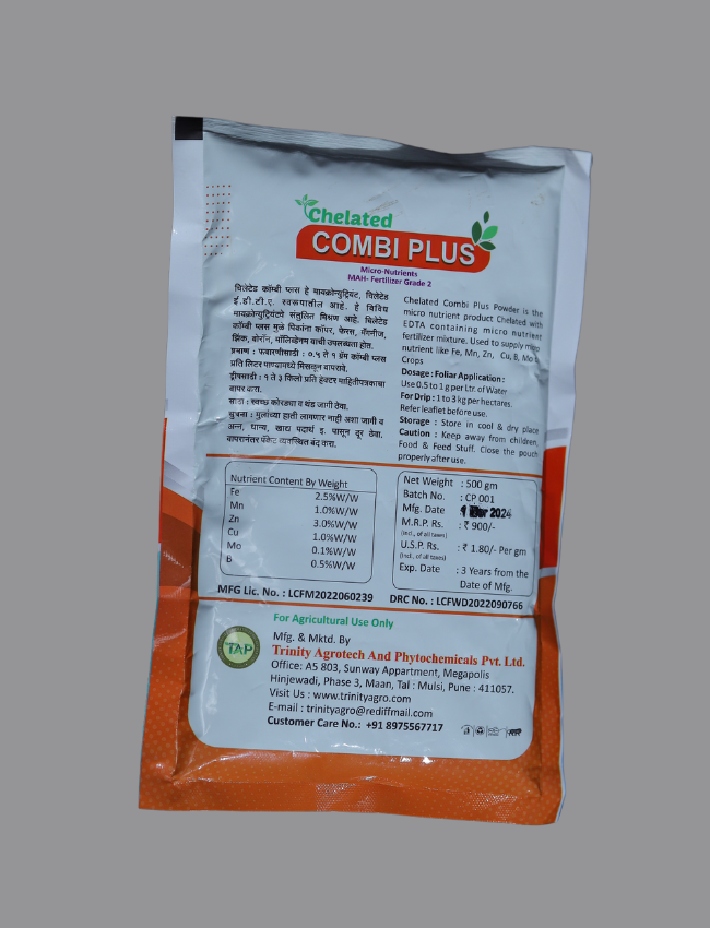 This micronutrient, chelated EDTA. is in the form of It is a balanced mixture of various micronutrients. Chelated combi pulses provide availability of copper, ferrous, magnesium, zinc, boron, molybdenum to crops.