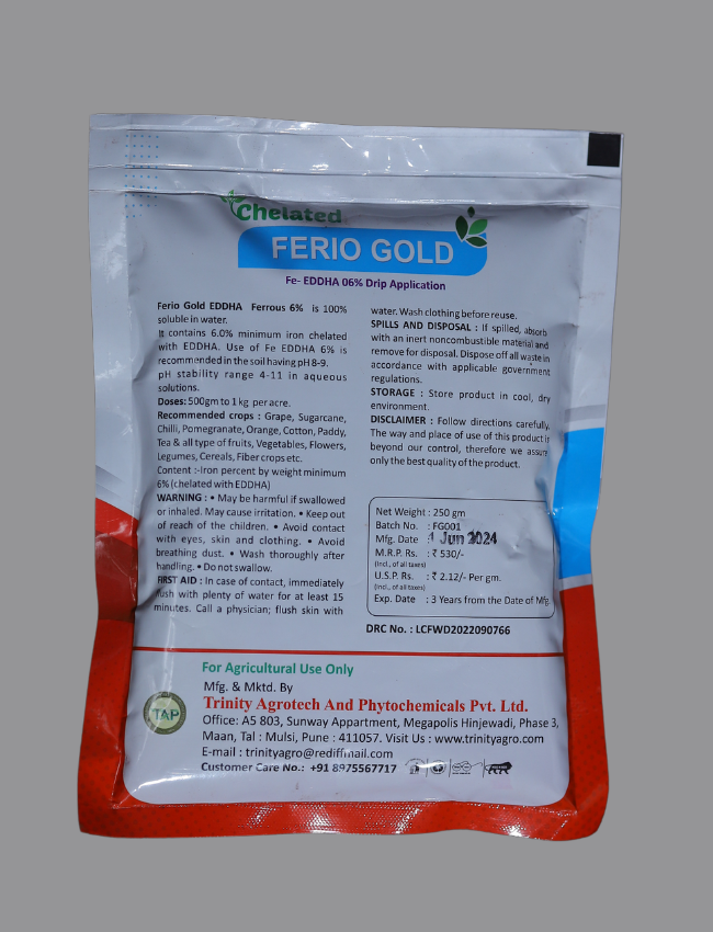 It Contains 6.0 % minimum iron chelated with EDHA. Use of FE